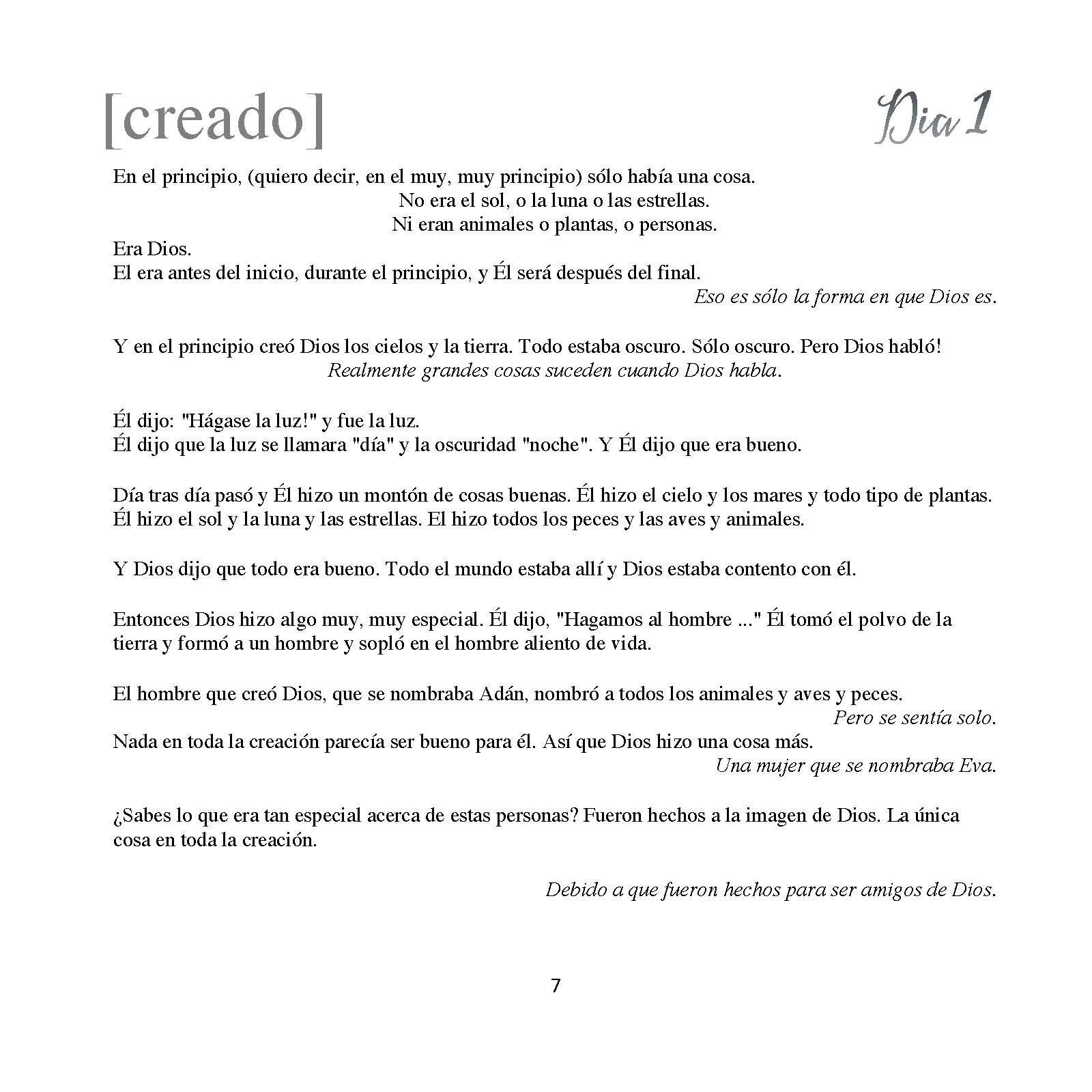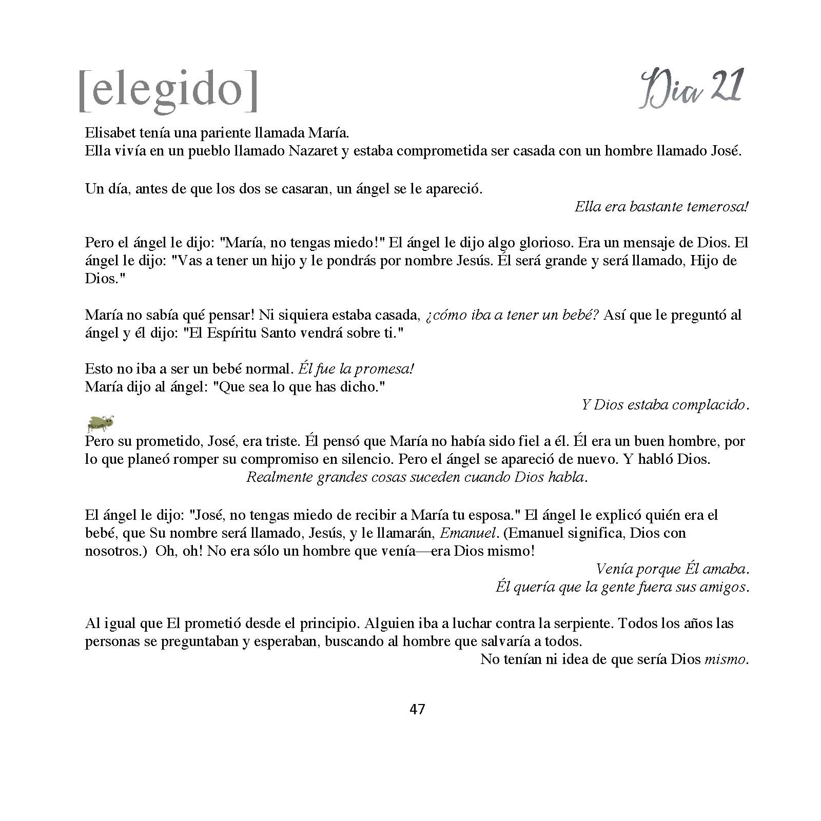 Para los niños más pequeños hay bichos pequeños y amables escondidos en algún lado de la página de cada día y para los niños más grandes hay una parte al final del libro titulado “Aprender Más” que les anima leer las historias originales de la Biblia.