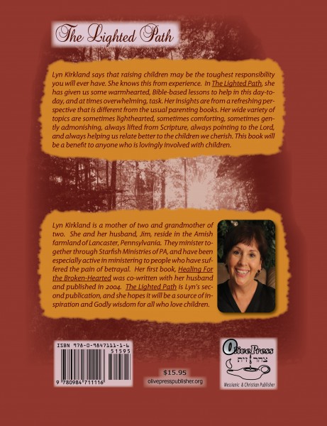 About the Author:  Lyn Kirkland is a mother of two and grandmother of two.  She and her Pastor husband are from the Amish farmland of Lancaster, Pennsylvania who now reside in Florida.  They minister together through Starfish Ministries of PA, and have been especially active in ministering to people who have suffered the pain of betrayal.  Her first book, Healing For the Broken-Heartedwas co-written with her husband and published in 2004 (now re-published through Olive Press as Healing For Your Broken HeartThe Lighted Path is Lyn’s second publication, and she hopes it will be a source of inspiration and Godly wisdom for all who love children.